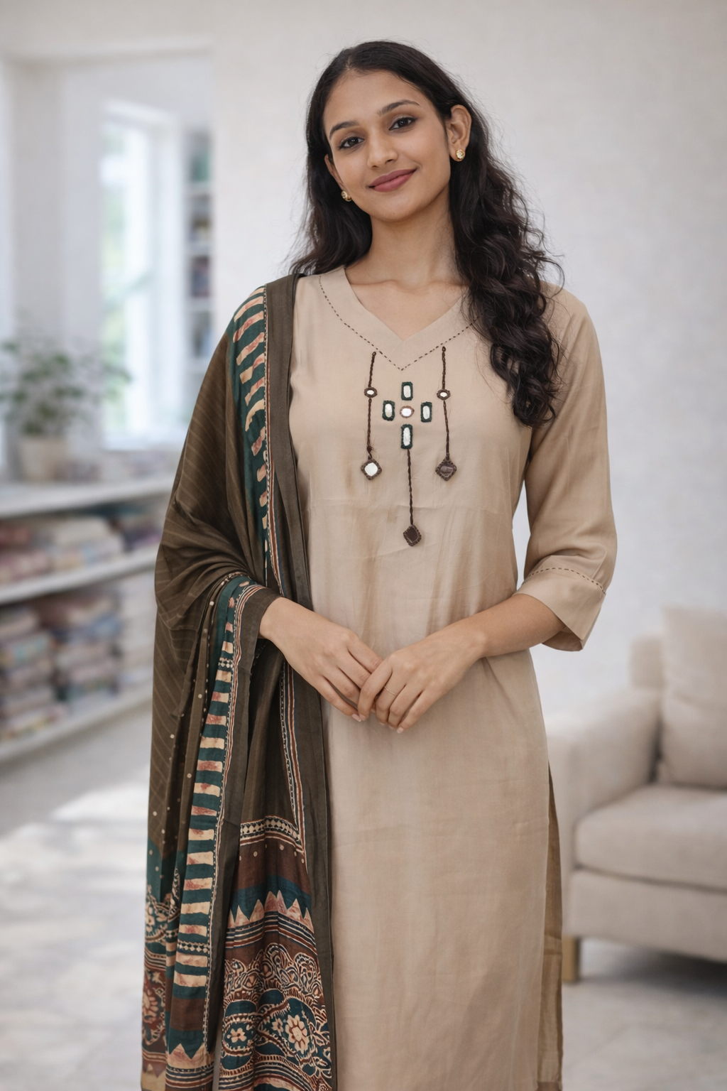 Mustard Silk Blend Embroidered Straight Kurta Set with Dupatta
